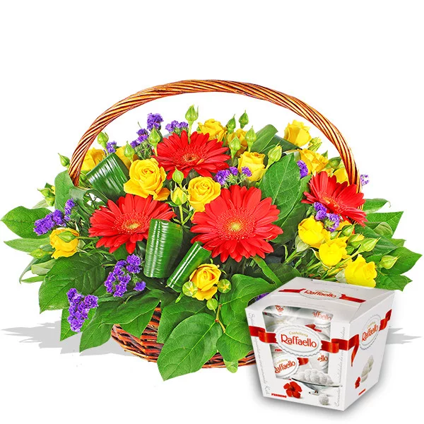 Уменьшенный: гербера оранжевая - 3 шт., роза желтая кустовая - 3 шт., статица - 5 шт., декоративная зелень, оазис, корзина малая. + конфеты "Raffaello" 150 г. - 1 шт.