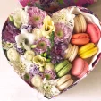 Стандартный (на фото): хризантема белая - 1 шт., хризантема фиолетовая - 1 шт., эустома фиолетовая - 1 шт., роза белая - 5 шт., гвоздика сиреневая - 2 шт., фрезия фиолетовая - 2 шт., оазис, фетр белый, макарунс - 8 шт., коробка в виде сердца (20х20см).