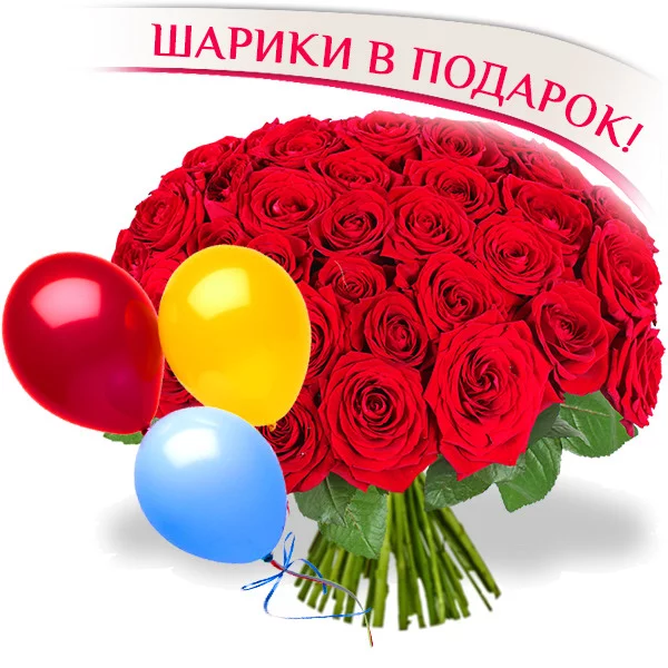 51 роза: роза красная - 51 шт. (высота розы - 50 см), 3 разноцветных шара (красный, желтый, синий).