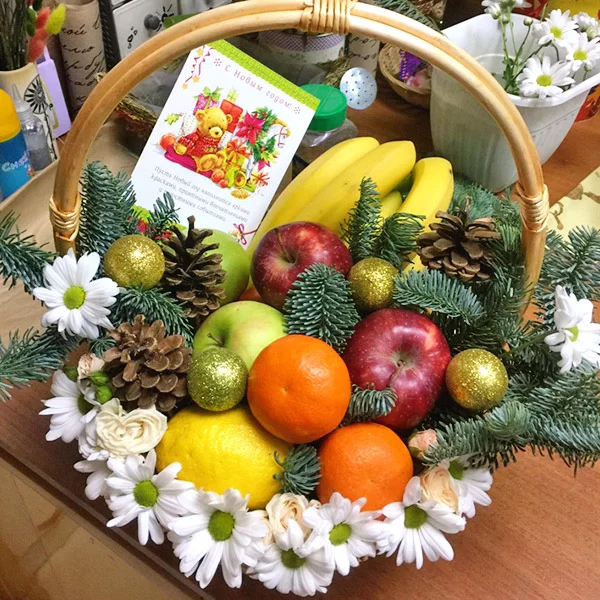 Фруктовый год - корзина с фруктами и новогодним декором