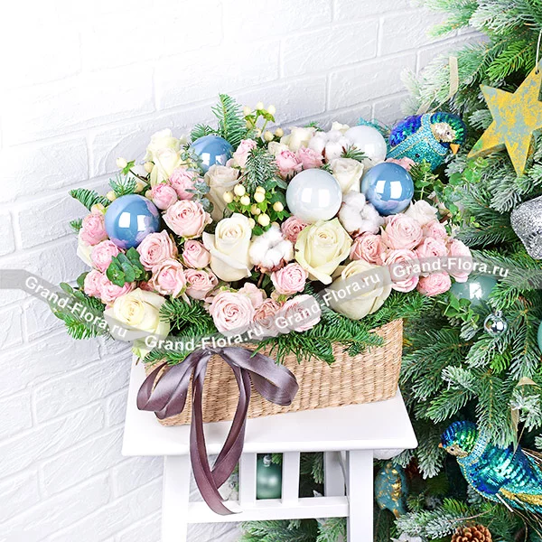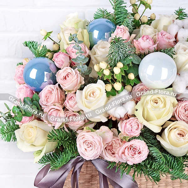 Стандартный: роза кустовая розовая - 8 шт., роза белая - 9 шт., гиперикум белый - 3 шт., хлопок - 4 шт., эвкалипт, ель, шарики - 5 шт., оазис, корзина средняя.